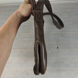 This brown leather shoulder bag features a distinctive asymmetrical shape. Its compact design is complemented by a reliable zip closure, making it a stylish and functional accessory.