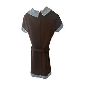 This dress features a sophisticated color contrast with its brown body and light blue accents. Its short sleeves and belted waist create a flattering silhouette. Perfect for a polished look at work or professional events, it combines style and comfort with ease.