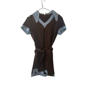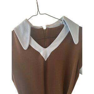 Vintage 60s Brown & Light Blue Short-Sleeve Tunic With Belt Polyester Retro