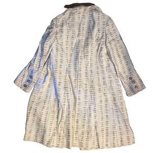 This vintage Bullock's Wilshire jacket from the 60s is a timeless piece that will add a touch of sophistication to any casual occasion. The mid-length coat features a geometric pattern in beige color, with a button-down neckline and long sleeves. The jacket is made of high-quality satin and is lined for extra warmth during the winter season.