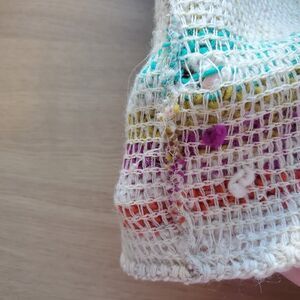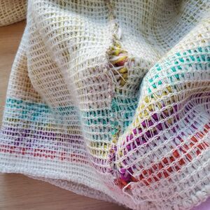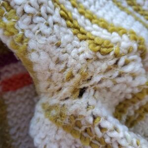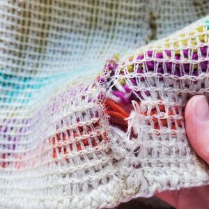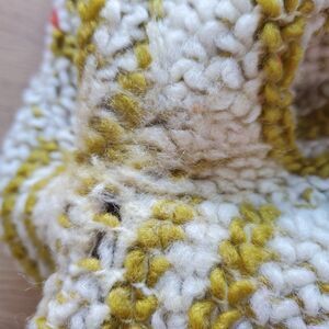 In poor condition. Has numerous scattered holes (armpits, side seams, neckline, arm cuff), scattered flaws in knitting, and matting to armpits, but is still functional/wearable. Could be repaired or upcycled by someone savvy.