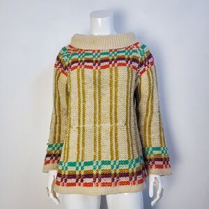 Vintage 60's Campus Casuals cream, avocado green, turquoise, purple, and orange long-sleeved sweater with wide turtleneck.