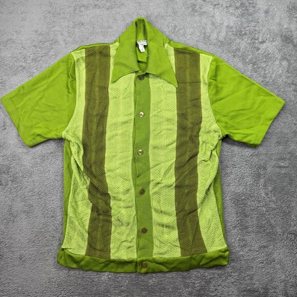 Authentic vintage late 1960s Carleton California mod knit shirt in a bold lime and olive green stripe pattern. Features textured vertical knit panels, single needle construction, and a wide dagger collar typical of the era. Tagged M. 70 percent acetate, 30 percent polyester. Made in USA. Beautiful color saturation and excellent condition with minimal signs of age.