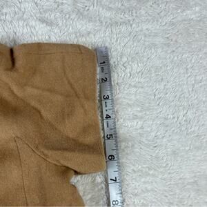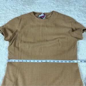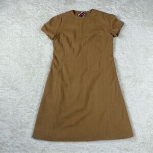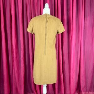 This Vtg 1960s shift style midi dress features a luxurious camel color, with crew neck, short sleeves, darts in bust, and a long zipper down the back. It is lined with SiBonne: This tailoring material, made by Armo, is no longer available. It is made of 51% bemburg rayon, and 49% avron. It has an anti-static finish, and it has a crisp hand. A good substitute would be silk organza.