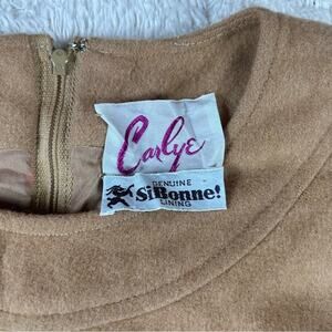 There is no fabric tag other than the Sibonne one, but the dress feels like a soft wool, and is well made and of sturdy construction. Union made by the ILGWU (International Ladies Garment Workers Union). This particular union label was in use from 1963 to 1974. The brand Carlye was first used in 1938, was registered in 1944, and was renewed in 1984. This brand is no longer in use. There are several marking on one side of dress near the hem, and some spots on the liner. I have included pictures of these for you. The sizing says 12, but vintage runs small, double check measurements!