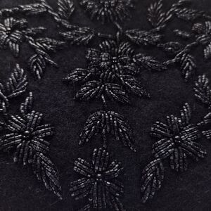 Vintage 60's. Sleeveless midi length shift dress with crew neckline and beaded floral motif on chest, unlined with back nylon zipper closure. The zipper pull will lay flat when you gently press it down.