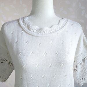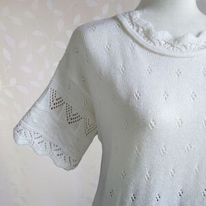 Vintage 60s College Point Pointelle Sweater Top Scallop Knit Short Sleeve Cream
