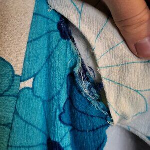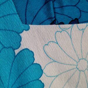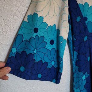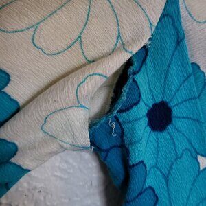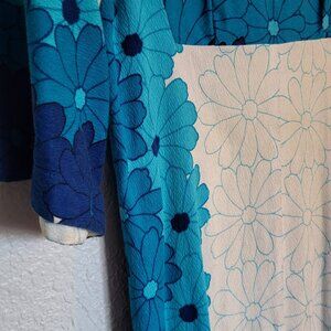 This vintage blue daisy pattern cotton maxi dress from the 60s was handmade in Hawaii. It is a beautiful piece that can be dressed up or down for any occasion. The different hues of blue contrast against the white like the clouds on a blue bird day in paradise. It does not have a size on the tag, though it was slightly snug on me as a medium girlie. In fact it was so snug that that armpits have slight rips in them that are easily fixable. This piece is still an absolute beaut and would be a treasure with a little TLC.