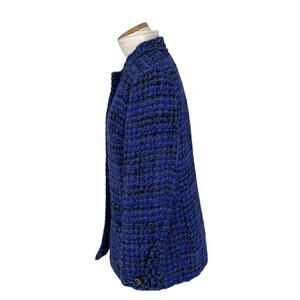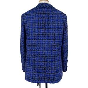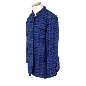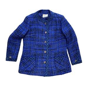 Elevate your wardrobe with this rare find couture jacket from the designer Tailorbrooke. Crafted from boucle fabric in a classic blue tweed pattern, this mid-length jacket is accented with buttons for a designer touch. This jacket is versatile for various occasions, whether it's travel, party, casual, formal, or business.