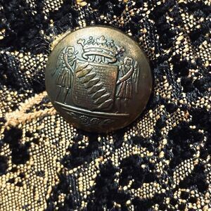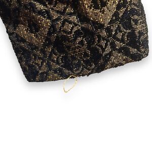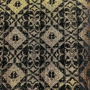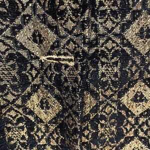 This interesting vintage blazer is in great condition. I only say that because unfortunately it’s missing a button. There are also a few pulled threads, but considering the age of this blazer, that’s not so bad. The pattern is kind of a diamond pattern with gold/yellow and black. There is some light padding in the shoulders. It’s very unusual and will definitely make a statement!