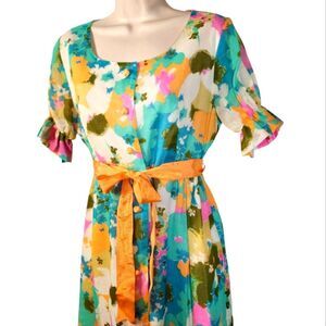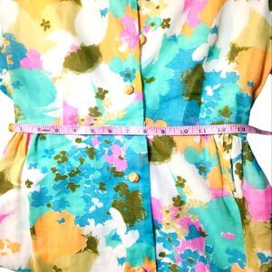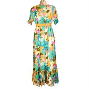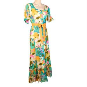Vintage 1960s Dress Juniors by Loungecraft Kaftan MUMU Maxi Ruffle Trim Floral Pink Orange Blue MCM Mid Century Modern Retro Short Sleeve Pastel Empire S