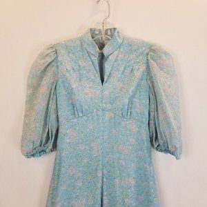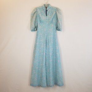 Step back in time with this vintage 60s cottagecore maxi dress. The romantic puff sleeves and chic blue floral print make this dress perfect for any summer occasion.