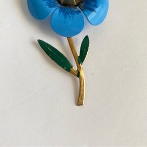 Vintage 60s Enamel Daisy Brooch Gold Tone Blue Flower Power Pin Retro