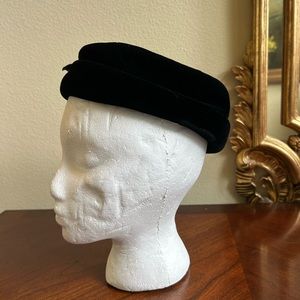 Vintage 60s Evelyn Veron black velvet pillbox hat with bow trim