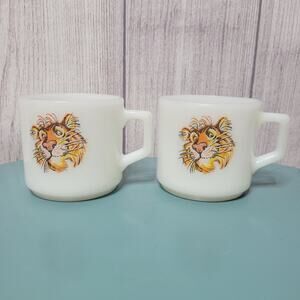 The Esso/Exxon issued coffee/tea set contains two 8oz milk glass mugs made by Anchor Hocking as well as a matching metal serving tray. This set features the Fire King tiger pyro-glazed on each mug and depicted in several active scenes on the tray.