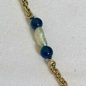 Features: Onyx and pearl stations on a gold-filled twisted link chain with a spring ring clasp. Marked AMERIK (gold Filled) FBM (Fredrich Binder Mohnsheim).