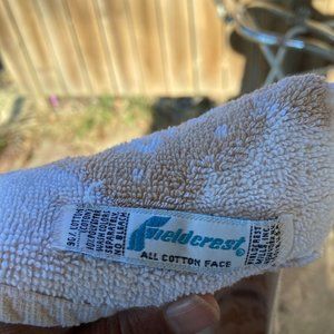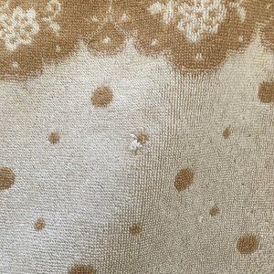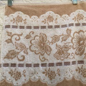 Vintage 60s Fieldcrest bath towel in tan and white with floral borders, polka dot middle.