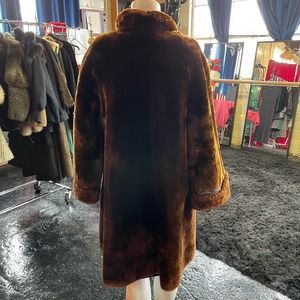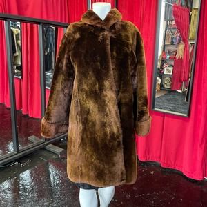 Vintage 60s Famous-Barr Co Brown Teddy Faux Fur Knee Length Coat Womens L/XL