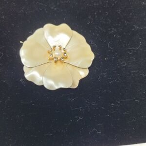 This elegant gold-tone flower brooch features a luminous faux pearl center surrounded by sparkling rhinestones. Add timeless charm to your outfit.
