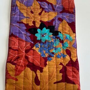 Retro vintage makeup or jewelry pouch made of floral fabric. 9" long x 4" high when closed and 14"h when open. Four zippered interior pockets. Second pocket has an interior snap strap to hold item secure. Bottom pocket has piece of soft padding for delicate items. Very clean. Floral colors on outside are purple, maroon, black, teal green, white, rust, and tan. Outside maroon tie for closure.