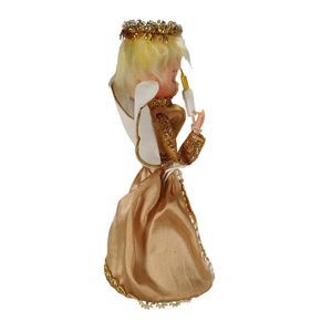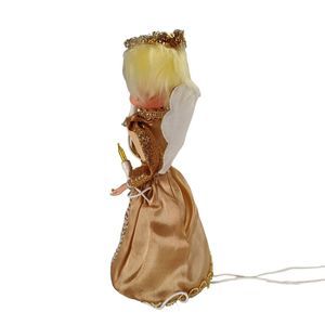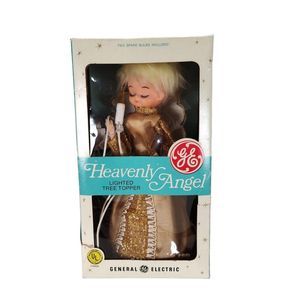 Vintage GE Heavenly Angel Tree Topper Blonde Caucasian angel in a gold dress, lights in hands and 8 lights in base (box says 11 but I'm not sure where the 11th light is). There are pipe cleaners holding the lights in the hand, mild signs of wear associated with age/use. Box with signs of wear and cello is coming loose. Please review all photos. I have two available Note to potential international buyers, this is wired for US voltage and may require an adapter for use in your country. Height: 10in tall Base Diameter: 4.5in with a 1in diameter inner hole