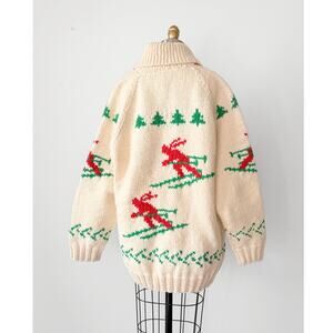 Vintage 60s Hand Knit Mary Maxim Cowichan Cream Ski Theme Wool Sweater unisex