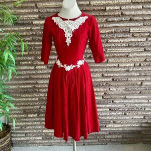 Vintage 50s 60s red velvet handmade dress with applied lace accents