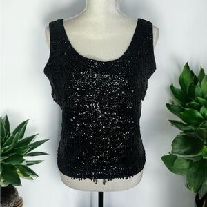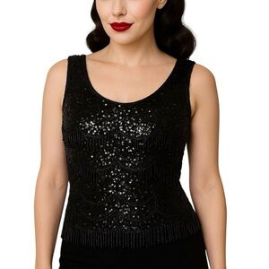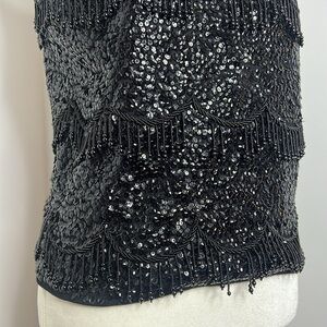 Vintage, Voquemont 1960s • 100% Pure Wool • Vintage Solid black All-Over Heavily Embellished Sequined & Beaded fringe scoop neck flapper style dressy glam evening wear top. Lined.
