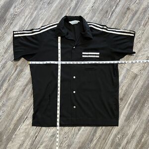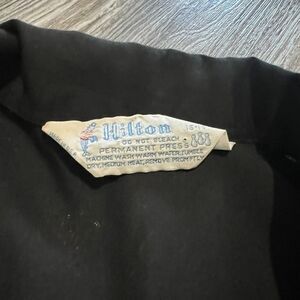 Vintage 1960s Hilton bowling shirt featuring “Camellia Lanes, Mobile, Ala.” back lettering. Black with white shoulder stripes and button-up front. Made in the USA.