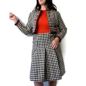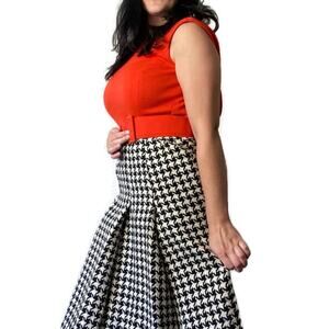 Great vintage condition! Fabulous bright orange pleated fit and flare dress with black and white houndstooth print. Sleeveless dress with a bright orange bodice and matching Houndstooth jacket with orange belt. Long sleeved cropped jacket with gold-tone braided bauble buttons and braided orange and black trim. One button has been reinforced, shown in last photo. Matching bright orange belt shown in 5th photo. Knee length with a flared large pleated skirt. Back zipper closure.