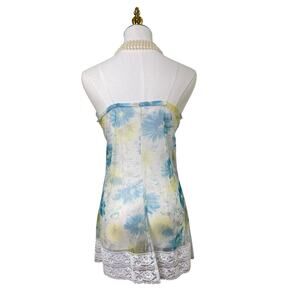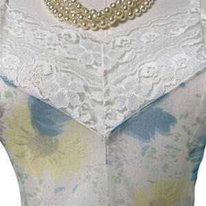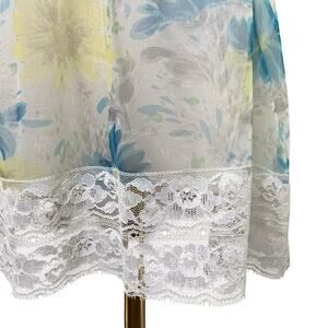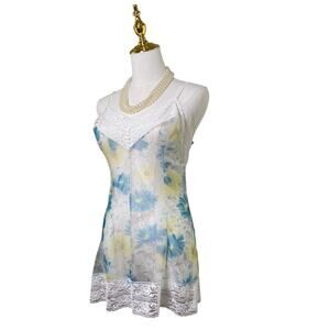 Beautiful Vintage 60s MOD Made in Italy Sheer Blue & Yellow Floral Nylon Micro Mini Full Slip Dress with Beautiful Floral Lace Trim and Adjustable Ribbon Straps