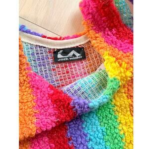 DETAILS: adorable and rare style by mid century designer, Jack Winter. Fun rainbow crochet with fringe hem shift dress.