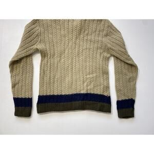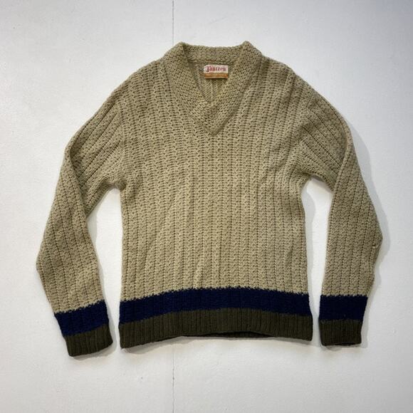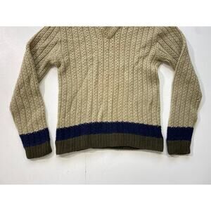Great pullover mens V neck sweater. Beige/tan with navy and green stripes at the hem/sleeve cuff