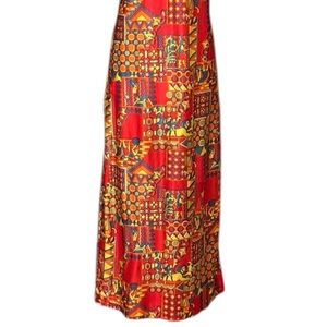 Step into a vibrant slice of vintage history with this rare late 1960s maxi dress by Joni Apple for Joni Originals Ltd. of Winnipeg. This sleeveless stunner features a bold, Egyptian Revival-inspired print with stylized ancient figures, lotus motifs, and psychedelic geometric patterns in vivid red, gold, turquoise, and orange.
