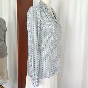 Camp collar. Cute gathered shoulders. Iridescent round shank buttons. Long sleeves with button cuffs.