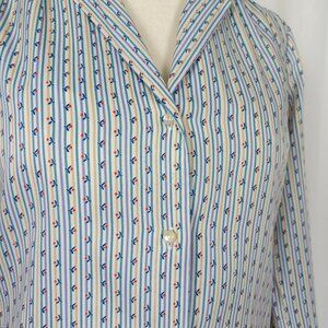 From Levi Strauss & Co. San Francisco, Cal. Soft & lightweight woven poly material. Blue, teal & tan stripes on a white ground, with red polka dot “flowers” & dark navy leaves.