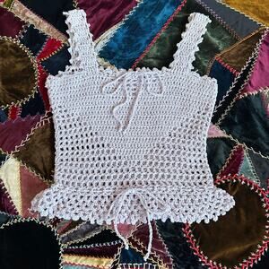 Vintage 60s Lilac Hand Knit Crochet Sweetheart Peplum Coquette Tank Top XS