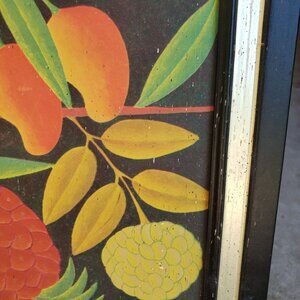 Vintage framed commercial process print from the 60s. Purchased from major regional retailer. Multicolored fruit on a black background. "Speckling" on the artwork and frame appears to be intentional. The frame is 23 x 27.