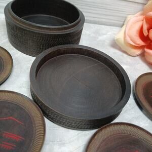 Vintage '60s MCM Japanese Carved Wood Coaster Set w/Matching Box *1 is Chipped*