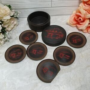 - Beautiful carved wooden coaster set with red Japanese landscape scene