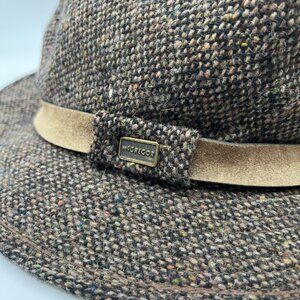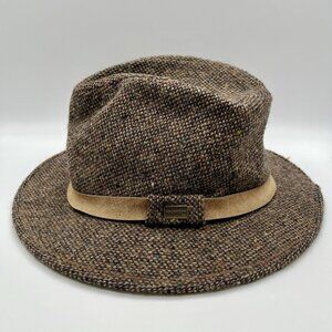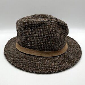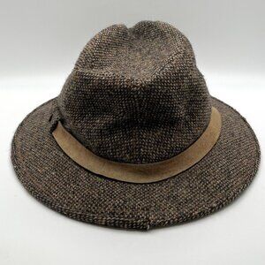 Classic vintage McGregor fedora-style hat featuring a brown speckled wool tweed body with subtle flecks of color, a soft faux-suede tan hat band, and a wide brim.