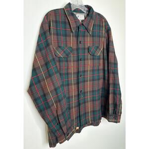 Authentic vintage 1960s Macy’s Supre-Macy wool blend flannel shirt. Classic green, brown, and red plaid with two flap chest pockets and button front. Made from a durable 85% wool, 15% nylon blend, perfect for workwear or casual layering. Features longer pointed collar, boxy cut, and rugged heritage style. Shows some wear and minor staining at hem (see photos), adding to its authentic vintage character. Size XL (17–17½). A timeless Americana piece, ideal for lumberjack, outdoors, or heritage looks.