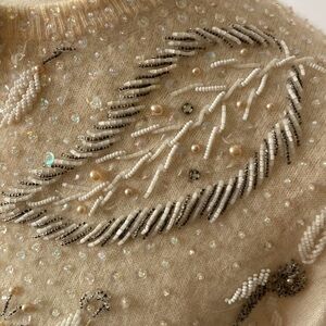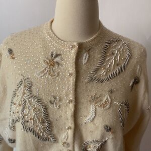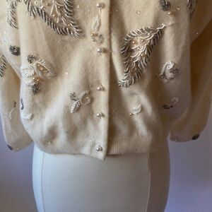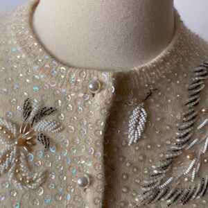 This one is a showstopper! Vintage 60s McMullen beaded cardigan from a fine clothing collection. This gorgeous sweater has a cream background and is decorated with silver, gold, and black beads and sequins in feather and flower patterns. Lambswool, angora, and rabbit fur blend. Tag says “Decorated in British Crown Colony Hong Kong.” Fully lined. Women’s size small. Comes with a silk storage bag that buttons, complete with "moth away" protection! Excellent pre-owned condition, no flaws. Measurements in photos.