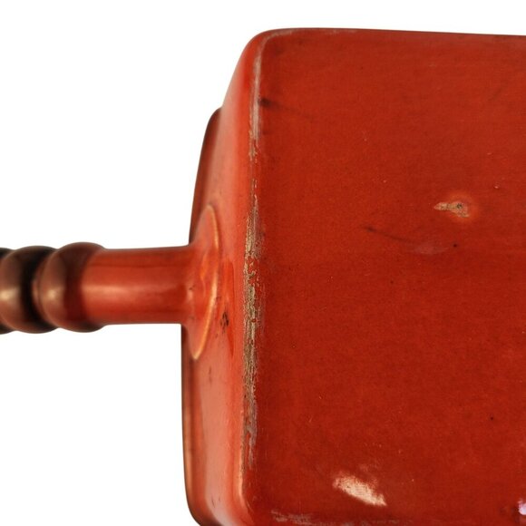 Crafted by Metlox Poppytrail, this Mid Century Modern dish features a vibrant orange-red glaze, a sleek rectangular shape, and a convenient divided design with a handle. 1960's