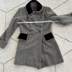 Step into classic 60s sophistication with this double breasted coat, featuring a luxurious velvet collar and (faux) pocket flaps for an extra touch of class. Crafted from a warm and structured wool blend, this coat showcases a timeless herringbone pattern, mid-length silhouette that flares just slightly, and a tailored fit—making it the perfect statement piece for fall and winter. Whether paired with sleek boots for a mod-inspired look or layered over office attire, this coat is a true vintage essential that never goes out of style.