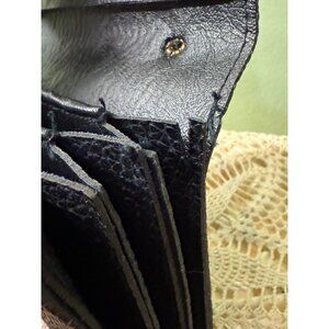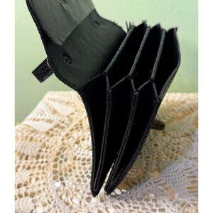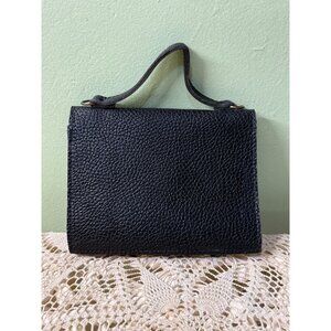 Chic and timeless, this vintage 60s mini purse features sleek black pebble leather with a distinctive escutcheon clasp. Perfect for adding a touch of retro elegance to any outfit. This measures 6.5" wide and 5" tall. It opens to four accordion like compartments. The handle has a bend from the way it was stored. The inside edge has a tiny little spit in the leather. This bag does not look to have been used much if at all. It is clean and very nice condition. The top handle has some rings where a strap can be added but I don't have one included.
