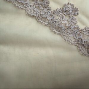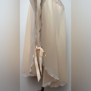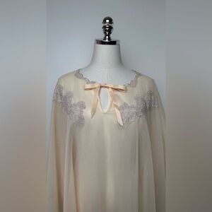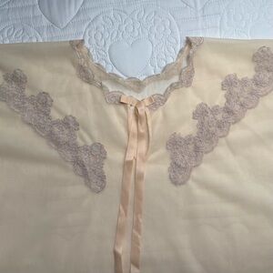 Made in USA. Adjustable ribbon at neckline and both arm openings. Keyhole detail. Lace appliqué and trim. Ribbon is a light peach color and the nylon is a peach color. Color is deeper than shown in pictures