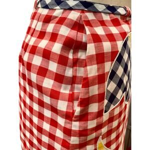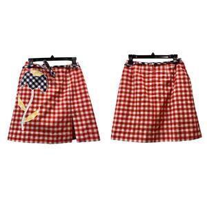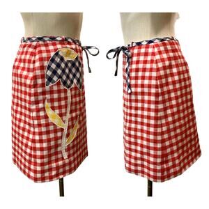 Amazing 60s era cotton tennis skort. Red & white gingham with very large flower, tulip on right side. One pocket on right side seam. Slit on left side hem, tie belt.