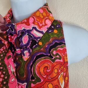Vintage 60s Mod Mini Dress S Barkcloth Button Front Pink Groovy Flower Power