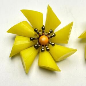 ☀️ Bring a burst of color to your look with these 1960s vintage mod flower clip-on earrings! Featuring sunny yellow petals with orange centers, gold-tone bead accents, and comfortable metal clip backs, these retro pinwheels are perfect for statement styling.